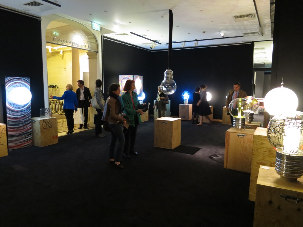 Musee en Herbe is a charity whose purpose is to introduce art to children. They have a small museum in the centre of Paris. For this exhibition they invited 29 of the World's leading light artist's to contribute works that would be sold in support of the charity and the Fondation Vasarely. Each artist was provided with a giant size Edison light bulb that they customised to make into a unique work of art. The exhibiton was taken on a short tour before being sold. (Fondation Vasarely, Aix-en-Provence; Fondation EDF, Paris; Christie's, Paris: June - July 2013) Here the works are seen at Christie's prior to their sale.