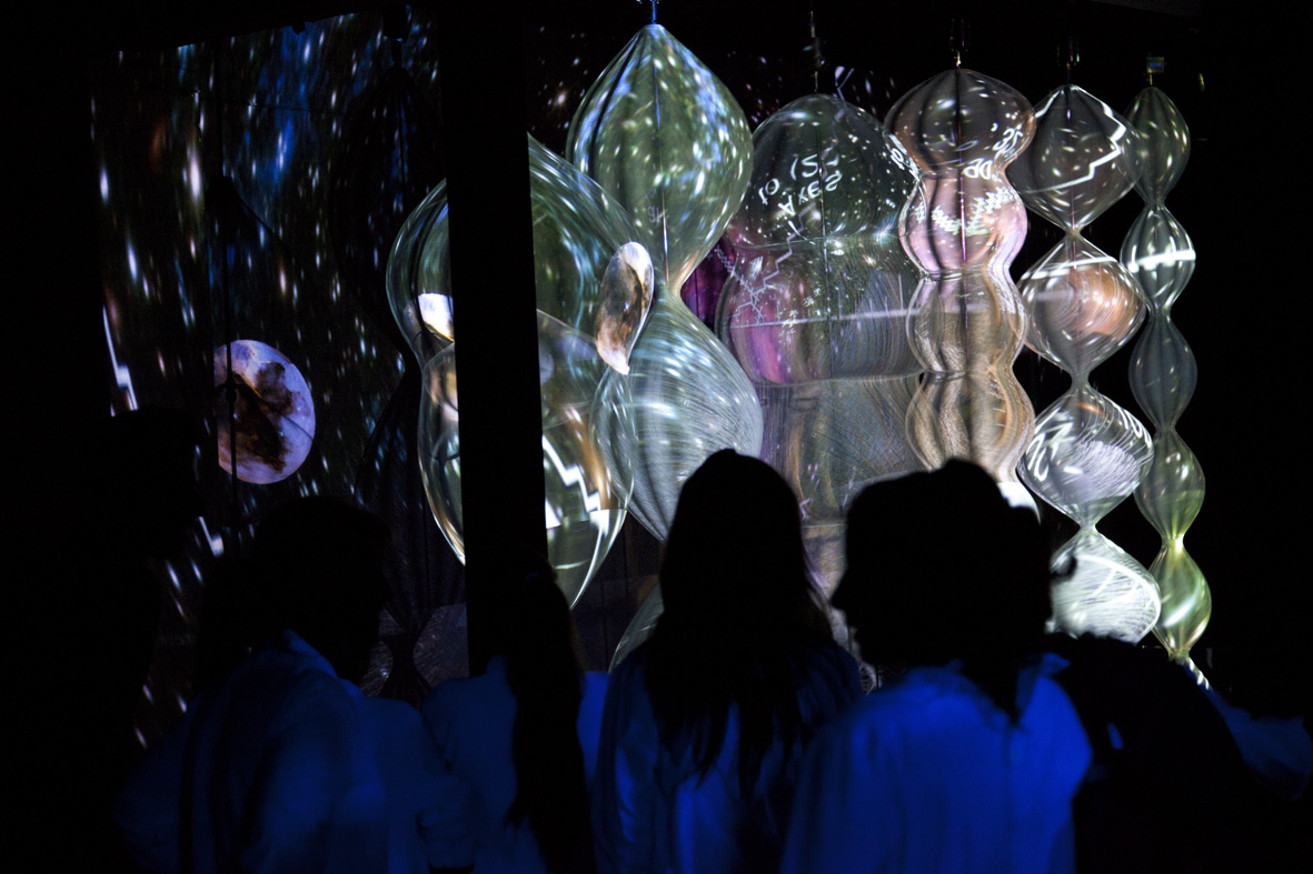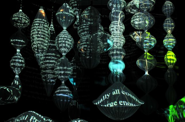 | The projections are a flowing stream of images. They blend abstract form with a virtual 3D model of Longo's galaxies together with text, figures and data selected from his work. Here you see fragments of the introduction to his paper. | ![]() |
