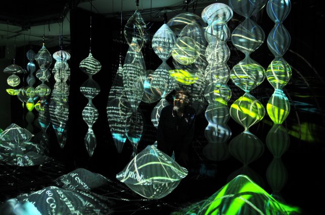 I have always been fascinated by cosmology, the study of the origin and overall nature of the universe, and this discovery maybe one of the most important developments in this field in my lifetime. I created Spinning Cosmos with the active support and help of Professor Longo. The light installation uses data gathered by Longo. It was premiered at MUMI in Montevideo as part of ArtFutura 2012. To learn more about the cosmology, click here. Many more links at the foot of this page including alink to video on You Tube showing entire festival.