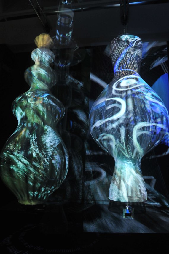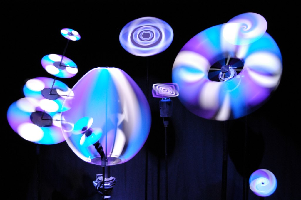 Central to the practice of kinetic art is the development of new media and techniques. Some years after leaving art college, I decided to invent works that were three-dimensional moving light projections. The Spinors were a first step in this direction. They are illuminated with chromastrobic light, light that changes colour faster than the eye can see. Their appearance is a result of the interaction between their form and the light illuminating them. They take their name from the spinor, an entity that first emerged as a purely mathematical concept but soon became a fundamental ingredient first in Dirac's version of quantum mechanics and later in all particle physics dealing with spin. A spinor has the peculiar property that if you rotate it through 360 degrees, it returns not to where it started but becomes the negative of itself. Continuing to rotate it through another 360 degrees will restore it to itself.