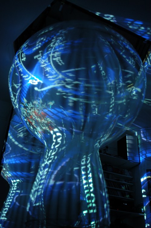 Group of three individual pieces, mixed media with five video projectors, ~ 6 x 6 x 6 metres.