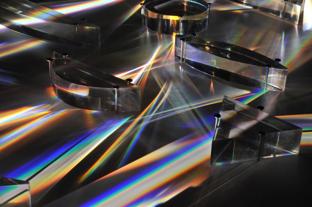 The earliest piece, Enigma of Light, was conceived while still at Art College. I work with light and its transformation as it passes through transparent media. The softly changing chromatic light moves in a timeless everchanging flow. In choosing a name I recalled what Einstein described as his happy thought of trying to imagine what it would be like to fly along beside a light wave keeping abreast of the waves as he moved. This was his inspiration for the discovery of the Special Relativity. He realised if he moved with the light waves time would cease to exist. From the moment he joined the light on its journey until when he again parted company with the light, no time would pass, and even if the light was going on a great journey, between stars or galaxies, still no time would pass. While for other observers, in different frames of reference, aeons would pass; to Einstein his journey would occur in an instant.