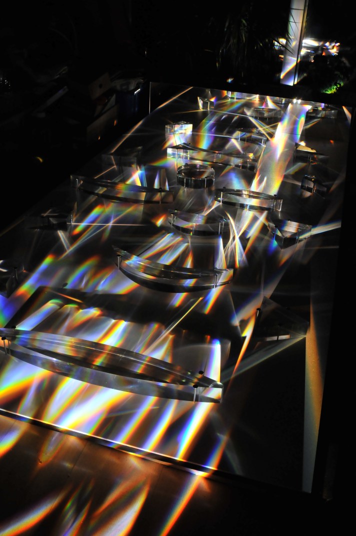 The earliest piece, Enigma of Light, was conceived while still at Art College. I work with light and its transformation as it passes through transparent media. The softly changing chromatic light moves in a timeless everchanging flow. In choosing a name I recalled what Einstein described as his happy thought of trying to imagine what it would be like to fly along beside a light wave keeping abreast of the waves as he moved. This was his inspiration for the discovery of the Special Relativity. He realised if he moved with the light waves time would cease to exist. From the moment he joined the light on its journey until when he again parted company with the light, no time would pass, and even if the light was going on a great journey, between stars or galaxies, still no time would pass. While for other observers, in different frames of reference, aeons would pass; to Einstein his journey would occur in an instant.